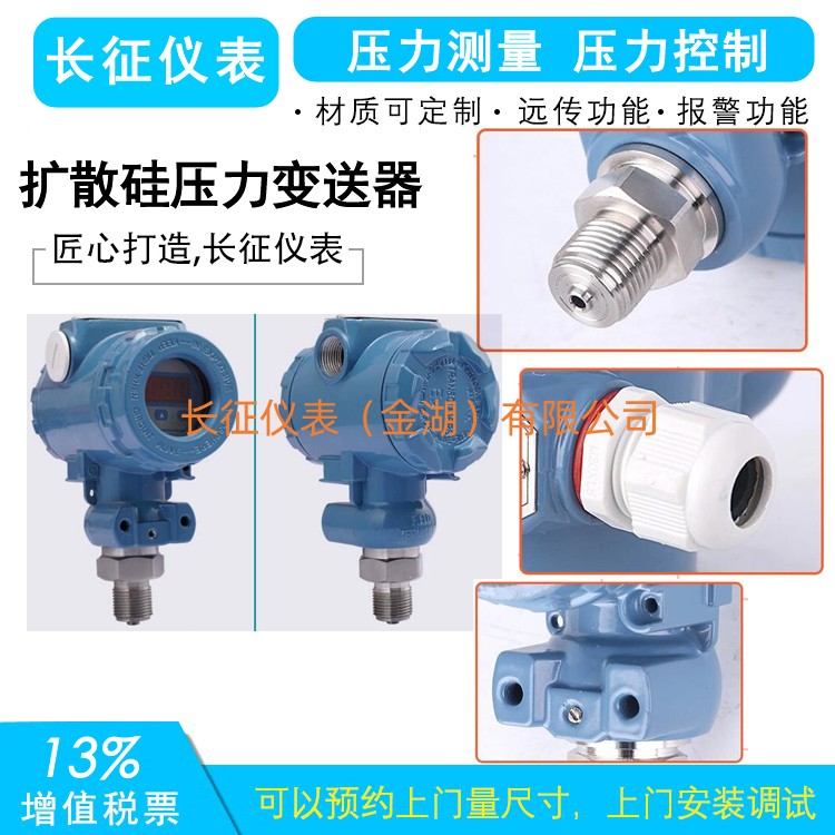 擴散硅壓力變送器主要特點抗過載和抗沖擊能力強,過壓可達量程的數(shù)倍,甚至用硬物直接敲打測量元件也不致使其損壞,且對測量精度毫無影響;安裝維護方便、可任意位置安裝。