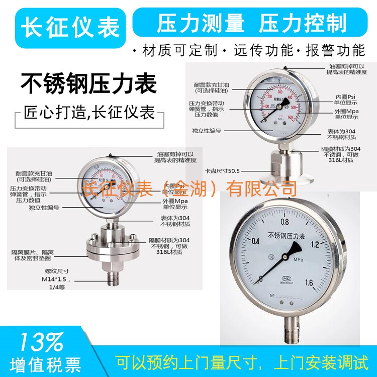 不銹鋼壓力表表采用直接接觸式接頭和感壓元件材料,采用icr18Ni9T、Ocr18Ni12Mo2Ti、 sus316,結(jié)構(gòu)為全密封型,不銹鋼壓力表具有較強的防被測介質(zhì)腐蝕和抗環(huán)境腐蝕的能力